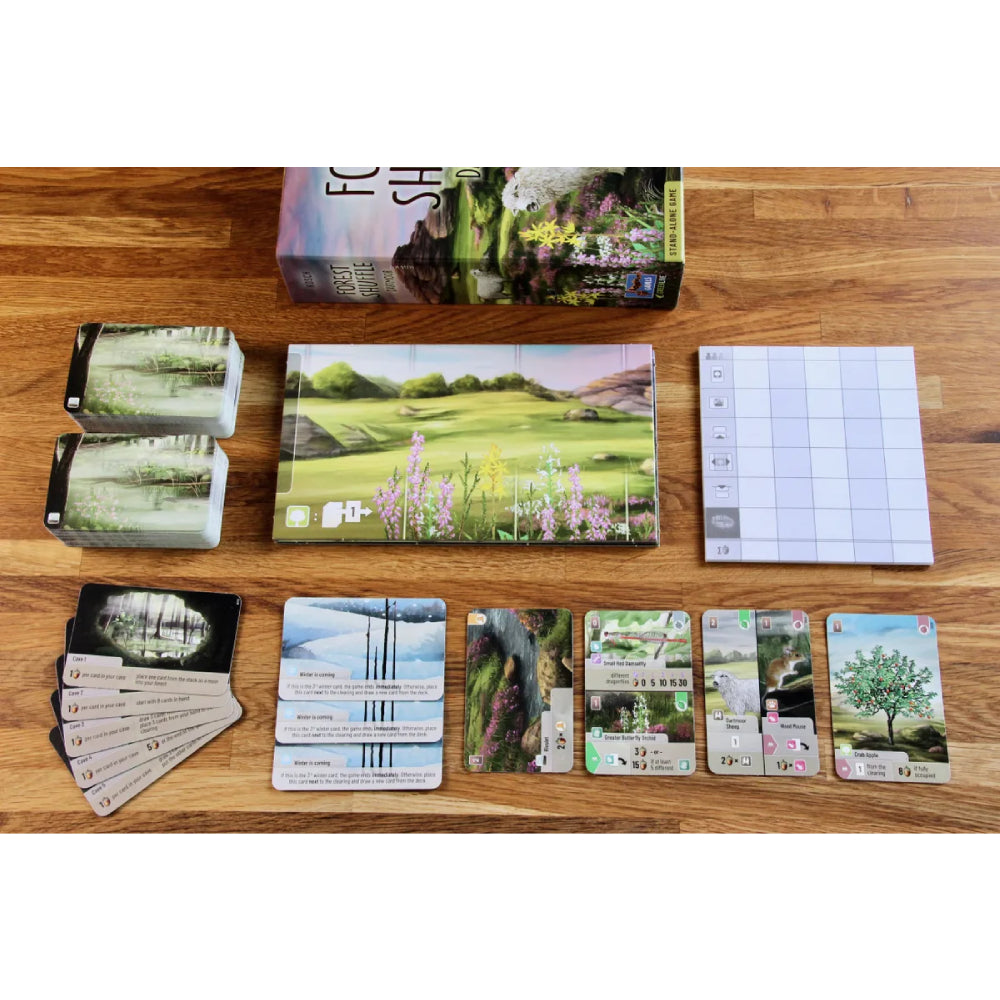 Forest Shuffle: Dartmoor este un joc de sine statator din familia Forest Shuffle si introduce un habitat complet nou, cu specii noi, abilitati si bonusuri noi de explorat. La fel ca in jocul Forest Shuffle original, in Forest Shuffle: Dartmoor jucatorii concureaza pentru a construi cel mai valoros mediu prin plasarea copacilor si arbustilor, apoi atragand specii in aceste locatii pentru a crea un habitat echilibrat ecologic pentru flora si fauna.