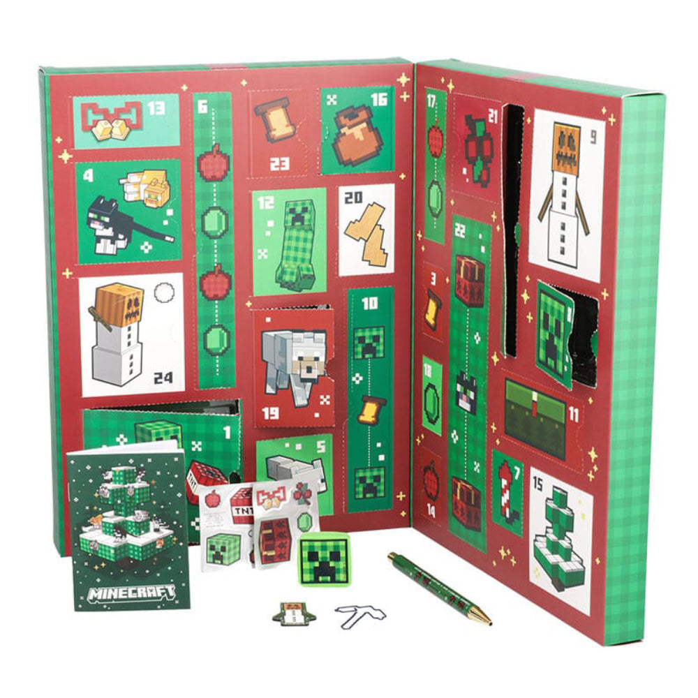 Calendarul Advent inspirat de celebrul joc Minecraft este plin de cadouri de papetarie de care te poti bucura tot anul. Include un caiet, notite autoadezive, blocnotes, pixuri, creioane, radiere, agrafe, o rigla, stampile, benzi washi, stickere pentru gadgeturi, semne de carte magnetice, un magnet si stickere din folie.