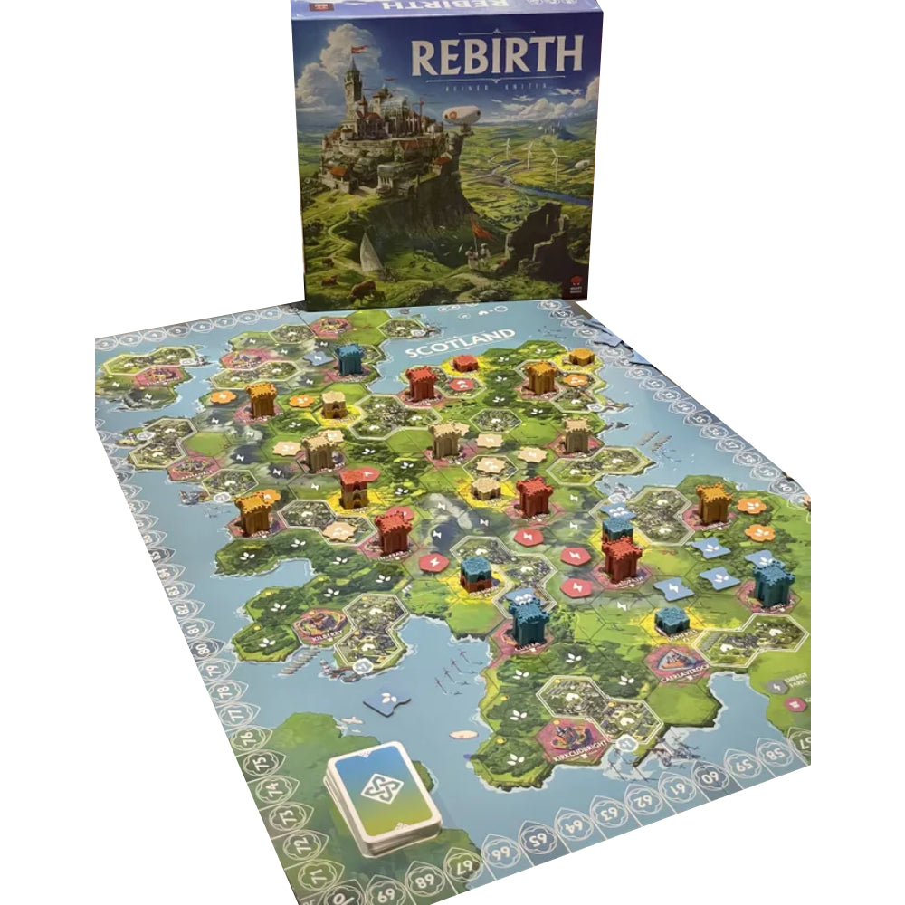 Rebirth este un joc nou, bazat pe plasarea de dale, creat de Reiner Knizia. Jocul revitalizeaza acest gen clasic prin combinarea mecanicilor elegante a lui Knizia cu constructia evocatoare a lumii create de Mighty Boards. Rezultatul este un eurogame cu un gameplay fluid, cu actiunea amplasata intr-un viitor luxuriant si plin de speranta. In fiecare runda, jucatorii trag o placuta din rezerva lor si o aseaza strategic pe tabla. Aceste placute reprezinta contributia clanului tau la reconstructia teritoriului. Rebirth recompenseaza previziunea strategica si jocul tactic inteligent, decizii mai dificile aparand pe parcursul jocului.