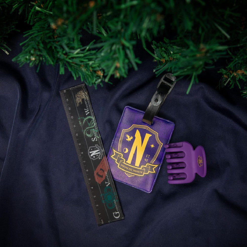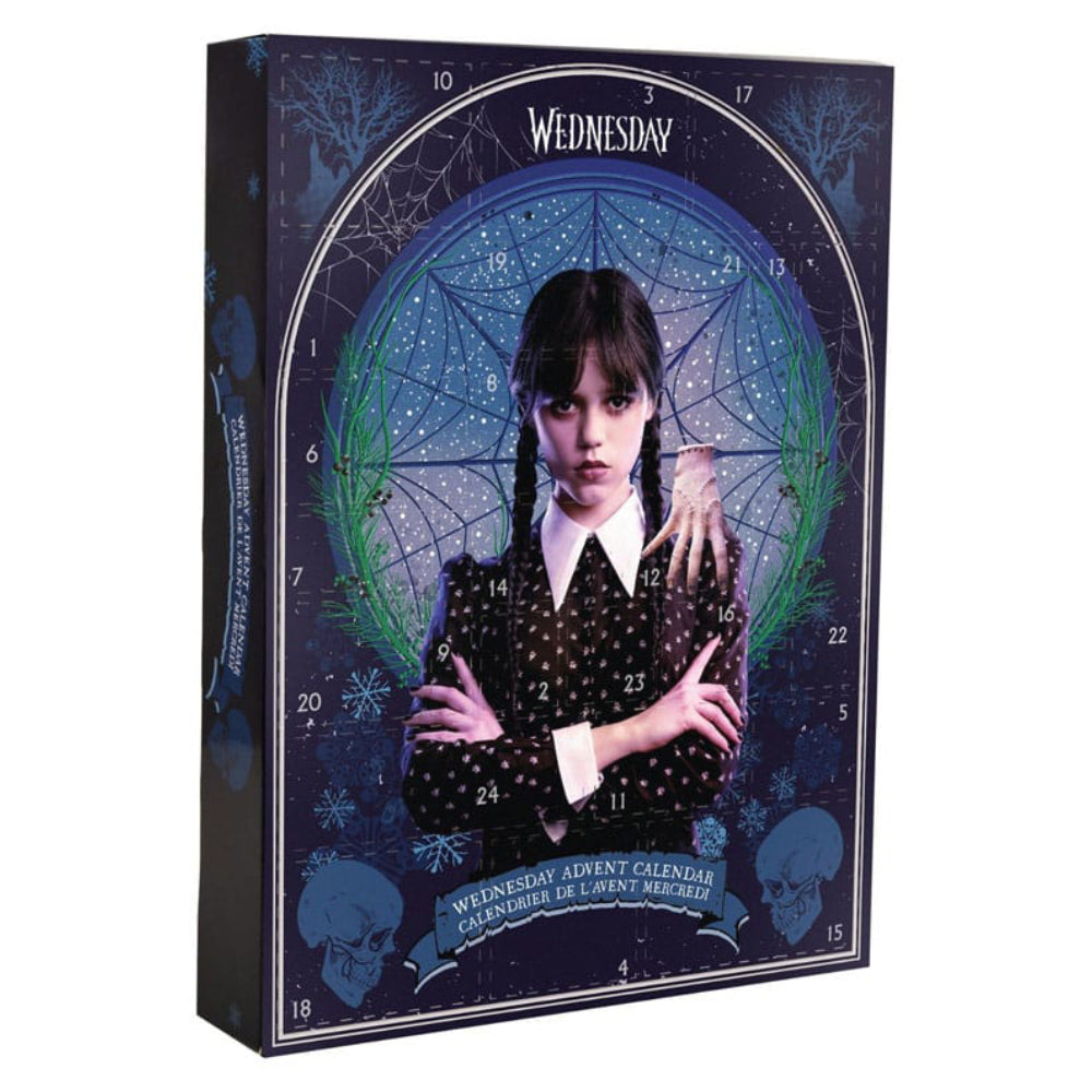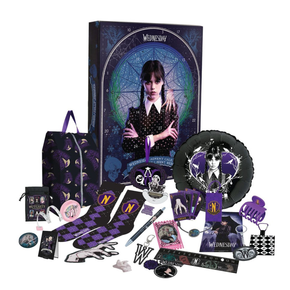 DESIGN ORIGINAL: Pregateste-te pentru sarbatori de neuitat, in lumea Wednesday. Un must-have pentru fani, acest calendar ofera o experienta unica si captivanta cu cadouri precum: saculet pentru pantofi, pix, sosete, breloc in forma de inel, ornament acrilic, bratara, pahar de jucarie, puzzle, stickere, semn de carte lenticular, patch, breloc de cauciuc, husa cu snur, brosa, agrafa de par, oglinda, insigna lenticulara cu insigna, rigla, magnet, eticheta pentru bagaj, breloc cu lant, geanta de cumparaturi.