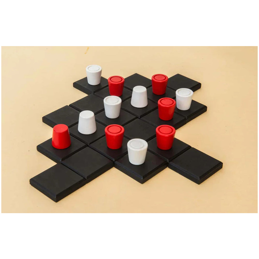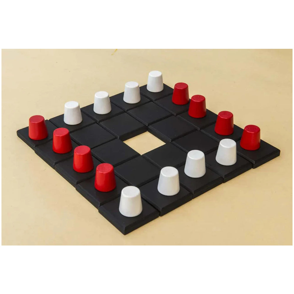 24 de table de joc patrate negre din lemn si 16 piese de joc rosii si albe – componentele jocului KARO sunt simple, practice si placute din punct de vedere estetic. Si ofera o varietate de posibilitati de joc!