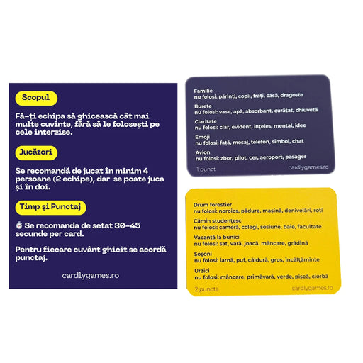 CardlyIn stock"Spune-mi fara sa-mi spui" este jocul care iti testeaza vocabularul si gandirea rapida. Pe fiecare cartonas sunt 5 cuvinte principale (pe care treb...