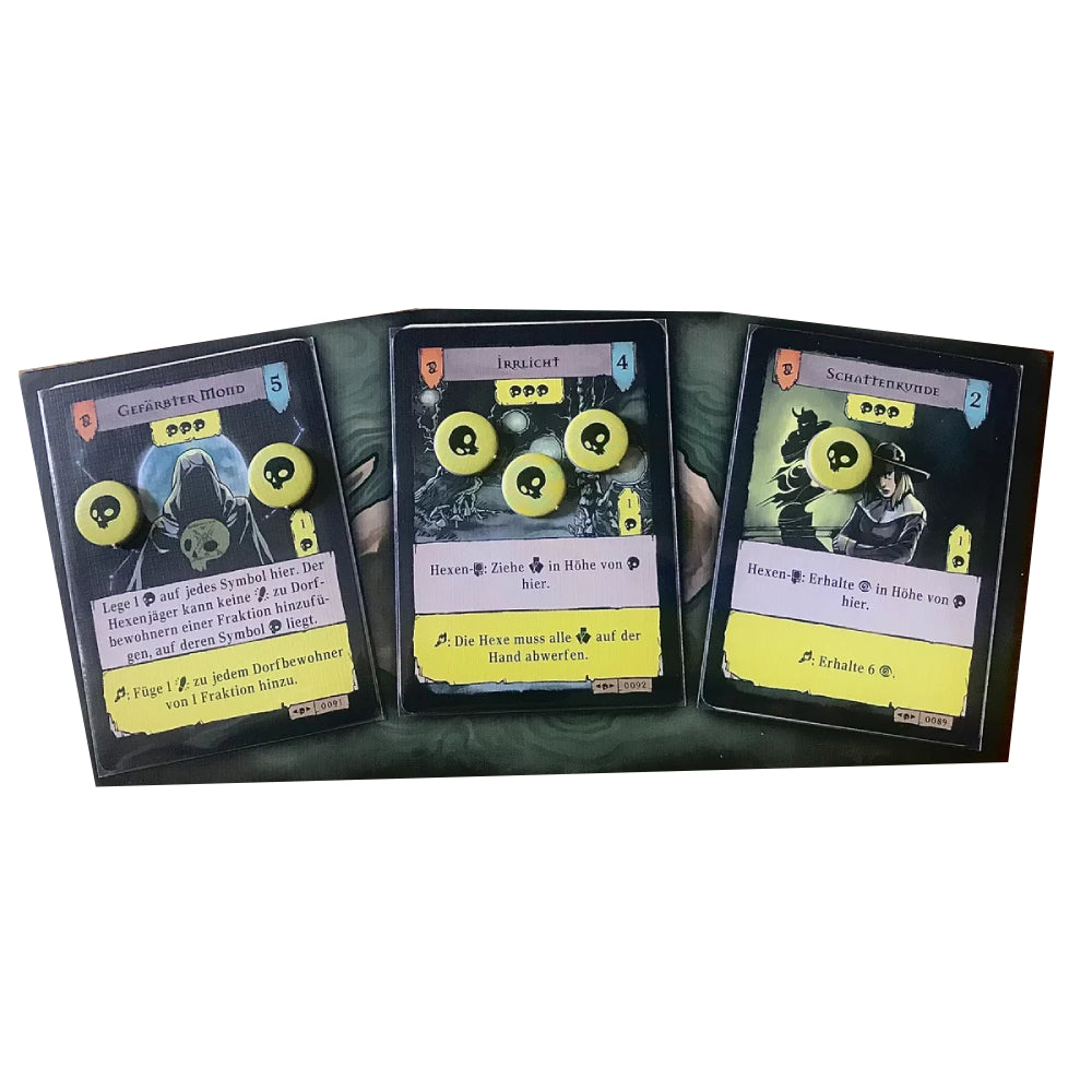 Fiecare jucator are propriul pachet variabil format din cincizeci de carti. Cu aceste carti, vrajitoarea poate prepara potiuni puternice, isi poate imbunatati familiarul si poate face descantece si farmece, in timp ce vanatorul de vrajitoare isi inroleaza aliati, revendica locatii strategice si ii investigheaza fara mila pe sateni.
