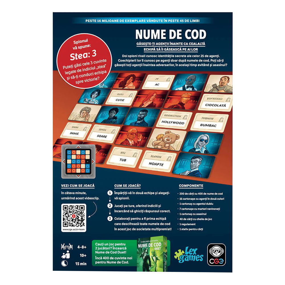 Nume de Cod - editia noua aduce un aer proaspat jocului clasic, cu o lista de cuvinte actualizata, ilustratii atractive, un insert nou pentru organizare si reguli mai clare si mai usor de invatat. Ideal atat pentru fanii vechi, cat si pentru jucatori noi.