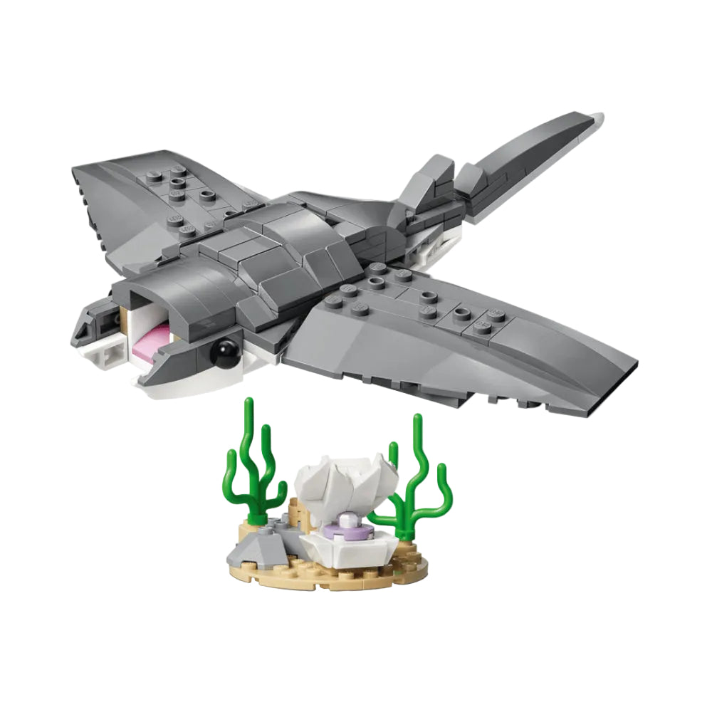 Baietii si fetele de peste 8 ani pot interpreta povesti distractive sub apa cu jucaria de constructie LEGO Creator 3 in 1 Rechin feroce cu un cufar de comori (31381). Acest impresionant set cu animale marine ofera copiilor 3 optiuni de constructie cu acelasi set de caramizi. Acestia pot alege sa construiasca un rechin articulat care poate fi expus pe un stativ cu un cufar cu comori si un crab. Apoi pot reconstrui modelul intr-un peste pescar pe un stativ cu plante marine sau intr-un diavol de mare articulat pe un stativ cu o scoica. Odata ce joaca si constructia s-au incheiat, fiecare model poate fi expus ca decoratiune interioara pe un raft sau birou.