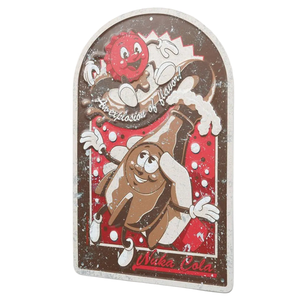 Aceasta placuta din metal este inspirata din lumea distopica a jocului video Fallout si infatiseaza brandul emblematic Nuka Cola.
