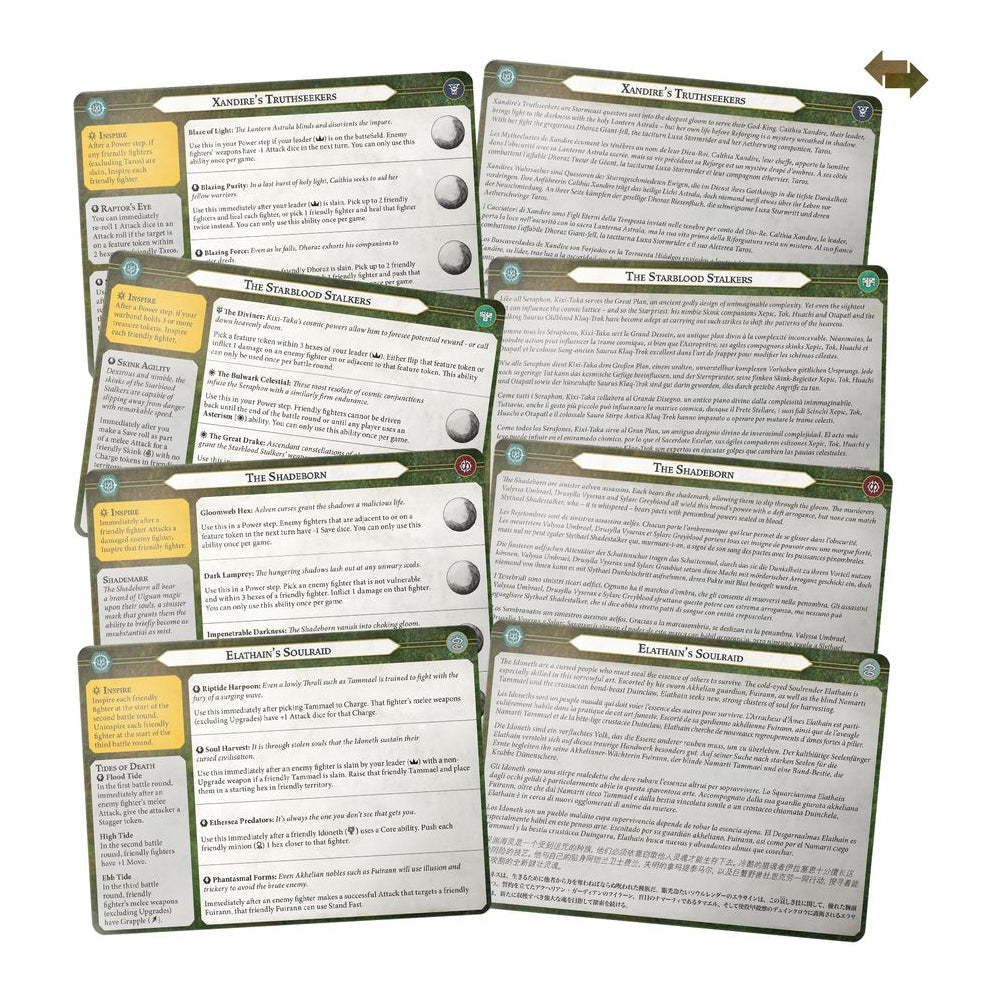 - 16 carti warscroll fata-verso (in engleza, franceza, germana, spaniola, italiana, chineza si japoneza).