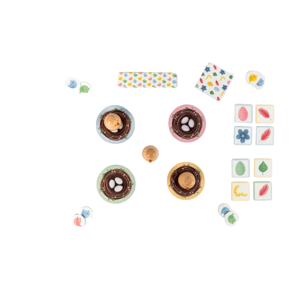 Intoarce placutele pentru a gasi elementele decorative potrivite ale cuibului. Jocul contine trei pasari frumoase din lemn, usor de prins.
