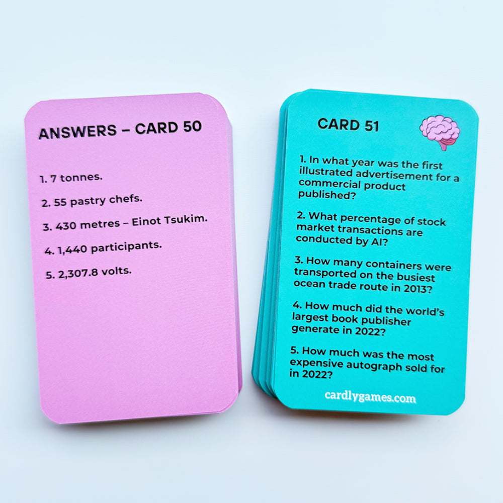 Fiecare carte vine cu 5 intrebari din diverse domenii: stiinta, istorie, geografie si multe altele.