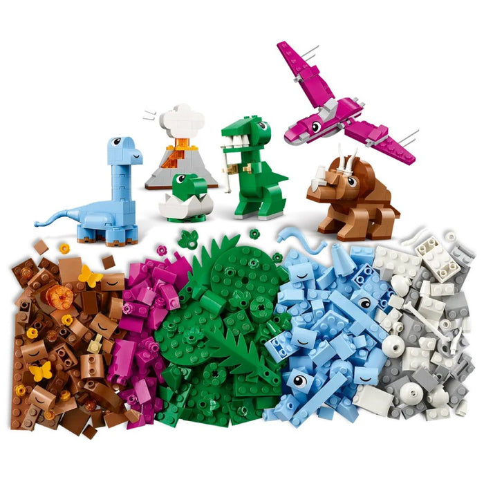 Dinozaurii LEGO rapid de construit infatiseaza un T. Rex, un pterozaur, un triceratops, un brontozaur si un pui de T. Rex intr-un ou, iar setul contine un vulcan, un palmier si accesorii pentru a inspira joaca fantezista a copiilor. Pe langa caramizile colorate si variate, setul include si elemente speciale, precum ochi si guri pentru a adauga expresii pe fetelor dinozaurilor. Distractia creativa continua cand copiii combina caramizile pentru a-si modifica creaturile. Pe masura ce copiii devin mai increzatori in abilitatile lor de constructie, pot urma ghidul intuitiv pentru a crea propriile modele fanteziste de dinozauri.