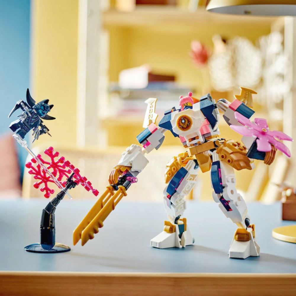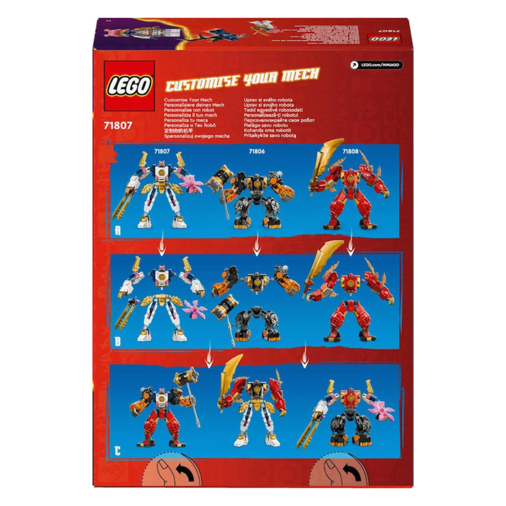 Fetele si baietii de 7+ ani pot recrea povesti din sezonul 2 al serialului TV NINJAGO Dragons Rising cu jucaria de aventura Robotul stihie tehnologic al Sorei (71807). Spectaculosul robot are brate si picioare articulate, astfel incat copiii le pot inclina si rasuci pentru posturi de lupta impresionante, plus o sabie mare, o lama rotativa si un cockpit pentru a plasa minifigurina ninja la interior.