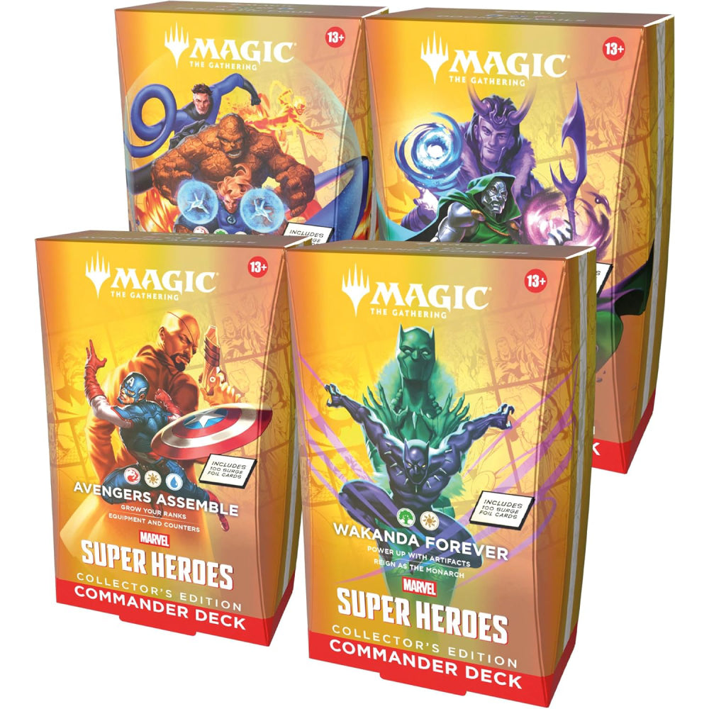 CONTINUT: Acest set include toate cele 4 pachete MTG Marvel Super Heroes Commander Collector's Edition. Fiecare pachet cu 100 de carti Surge Foil vine insotit si de 10 carti token Surge Foil fata-verso, 1 deck box, 1 ghid cu strategii si 1 carte de referinta.