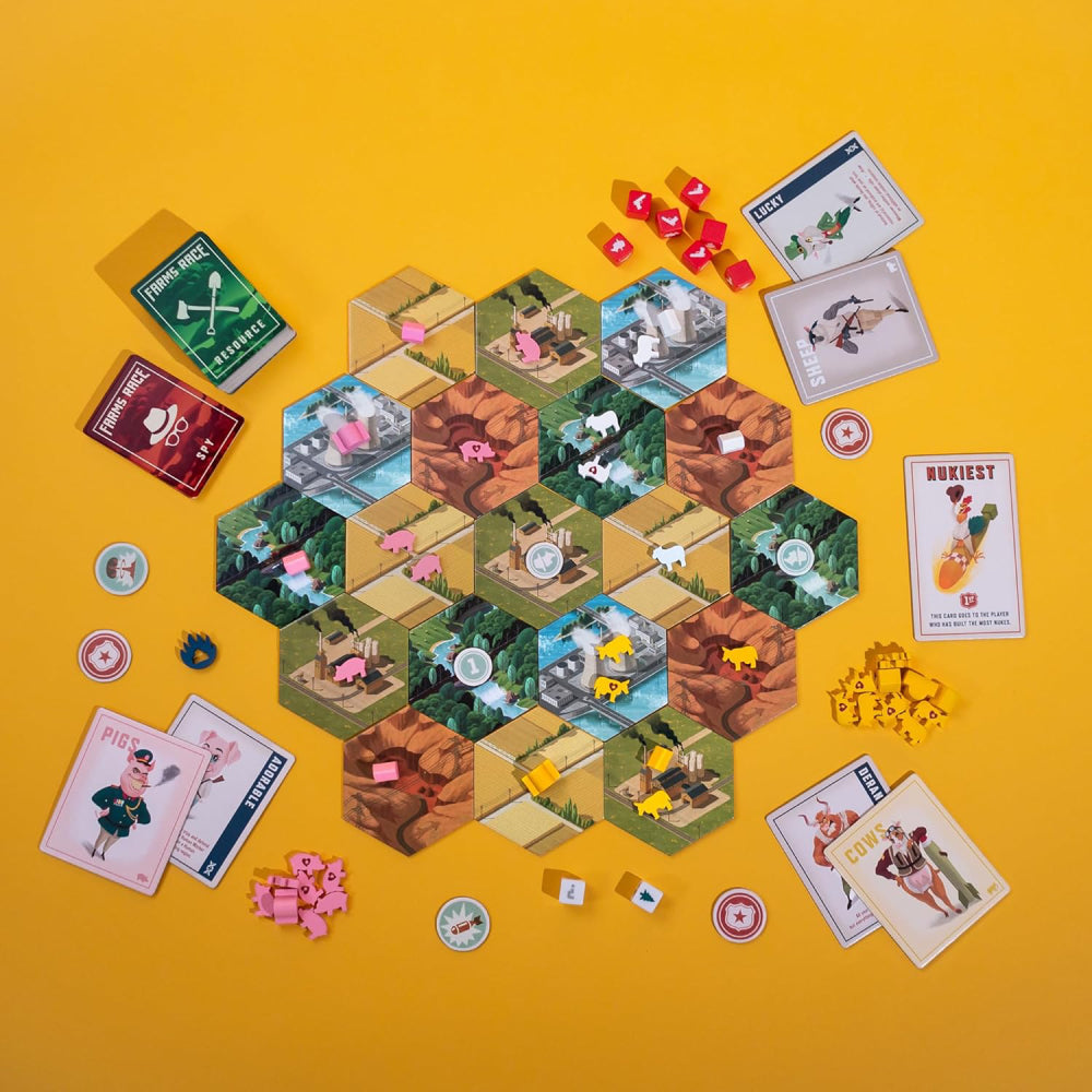 Farms Race este un joc de strategie de 1-2 ore care se aseamana cu un Eurogame cu arme nucleare. Desi adunati resurse si construiti, pentru a castiga sunt necesare unele incalcari grave ale Conventiei de la Geneva.