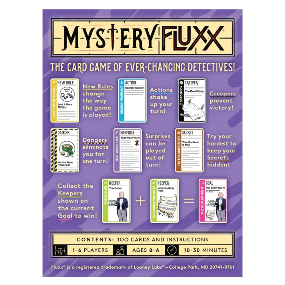 In Mystery Fluxx, o multime de detectivi incearca sa rezolve misterul adunand indicii, examinand locatii, gasind arme si descifrand secrete... toate acestea fara a fi eliminati!