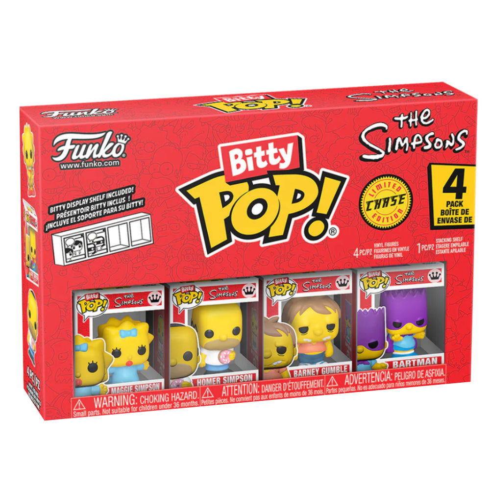 Extinde-ti colectia Simpsons cu acest pachet de 4 figurine Bitty POP! care contine  personajele Maggie Simpson, Homer Simpson, Barney Gumble si o figurina de colectie Chase Bitty POP!.