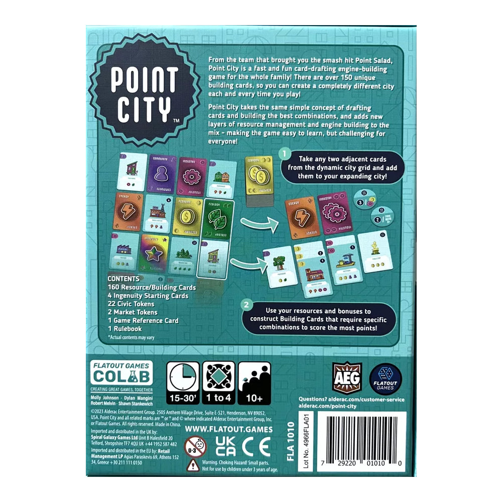 De la echipa care a adus jocul Point Salad, Point City este un joc de extragere a cartilor si engine-building, cu peste 150 de carti de constructie unice, oferindu-ti oportunitatea de a crea un oras complet diferit de fiecare data cand joci!