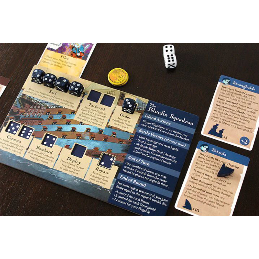 Sunteti spadasini si soldati pe marea vasta. In fiecare runda, veti da cu zarurile si le veti plasa pentru a efectua actiunile unice ale factiunii voastre. Pe masura ce controlati regiuni si livrati marfa, veti castiga Faima. Jucatorul cu cea mai multa Faima castiga!