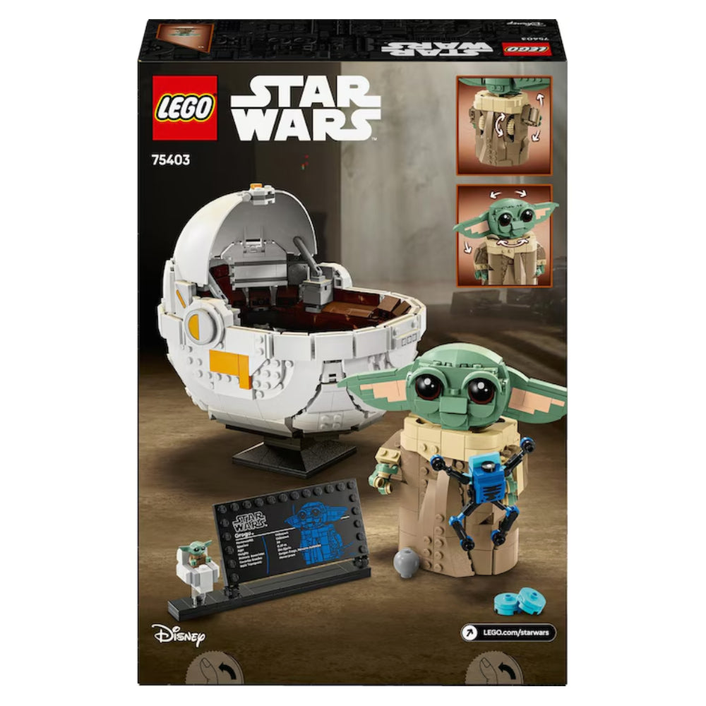 Modelul principal din acest set de constructie si de colectie Star Wars este insotit de o figurina LEGO Grogu de dimensiuni standard intr-un mic landou planor construibil, precum si de o placuta cu informatii care completeaza exponatul vesel.