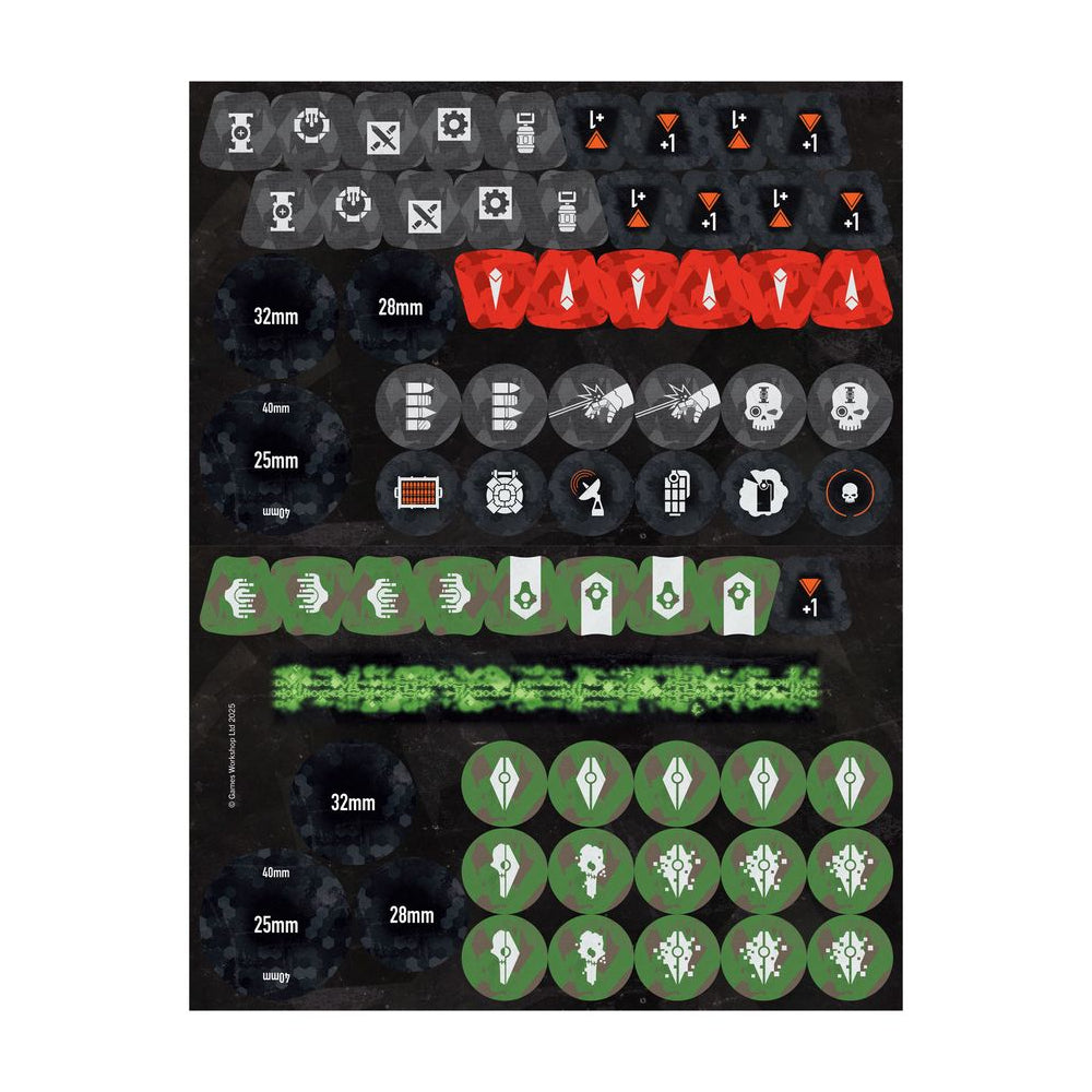 - fisa cu 67 jetoane din carton fata-verso, 39 pentru echipa de lupta Deathwatch si 28 pentru echipa de lupta Canoptek Circle
