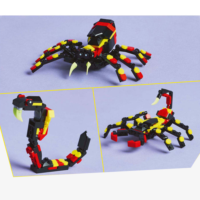 Iubitorii de animale cool primesc 3 optiuni diferite de constructie in acelasi set de caramizi: un paianjen LEGO articulat cu o sfoara extensibila, o figurina scorpion articulata sau un sarpe maiestuos articulat. Toate cele 3 figurine animale din acest set de jucarii care se transforma sunt cadouri creative si distractive pentru copii.