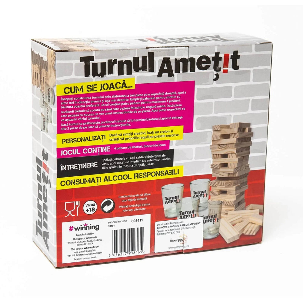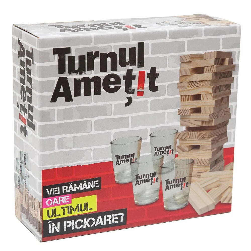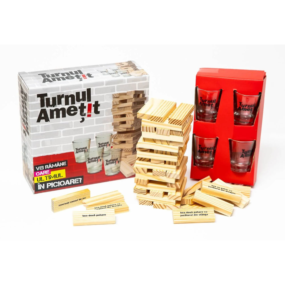 "Turnul Ametit" aduce adrenalina si distractia la un nou nivel, transformand o sesiune de joc intr-o experienta interactiva si amuzanta. Construit pentru maxim patru jucatori, jocul incepe prin alaturarea pieselor de lemn pentru a forma un turn stabil, in timp ce paharele de shoturi sunt umplute cu bautura preferata a fiecarui jucator.